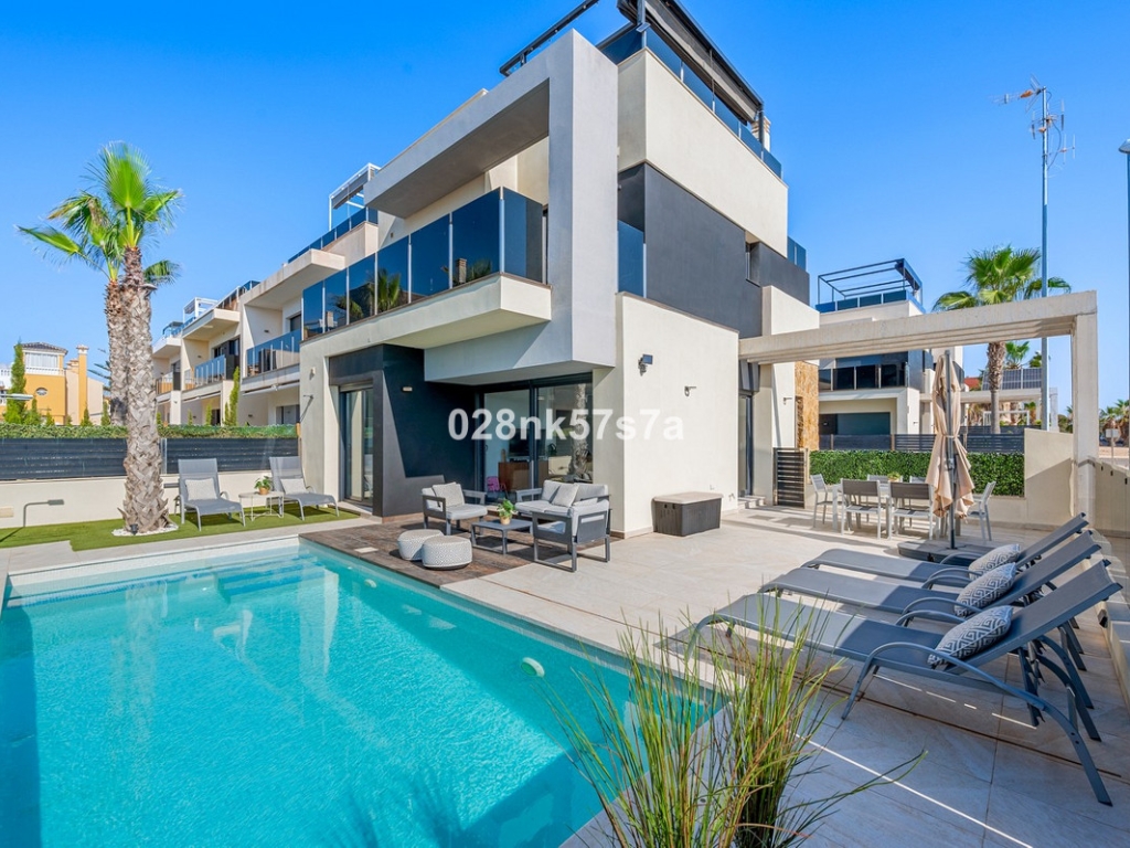 Villa Exclusive 4-bedroom villa, ideally located in the highly sought-after area of Lomas de Cabo Roig - just moments from the beach, renowned golf courses, and a wide selection of local amenities.This stylish property boasts a sleek and spacious design, offering four generously proportioned bedrooms, each with its own en-suite bathroom and high ceilings. The villa also features a private swimming pool, a rooftop solarium with panoramic sea views, and a large basement that can be adapted for fitness, entertainment, or extra storage. Designed for open-plan living, it includes high-quality finishes, plenty of natural light, and generous outdoor space – making it an ideal choice for both permanent residence and luxury holiday living. Property Highlights ✔ 4 Bedrooms | 4 En-Suite Bathrooms ✔ Private Swimming Pool ✔ Rooftop Solarium with Sea Views ✔ Large Versatile Basement ✔ Walking Distance to Shops, Restaurants & Beaches Location – Lomas de Cabo Roig Lomas de Cabo Roig is one of the most desirable neighbourhoods on the Orihuela Costa, celebrated for its laid-back atmosphere, modern infrastructure, and close proximity to Blue Flag beaches. The area offers convenient access to international schools, prestigious golf courses, marinas, and a wide range of dining and shopping options – all within a short distance. Whether you're searching for a stylish coastal residence or a sound investment property with strong rental potential, this villa delivers the perfect combination of comfort, location, and refined living. Get in touch today to arrange a private viewing or receive more information about this exclusive opportunity.Buy with confidence
