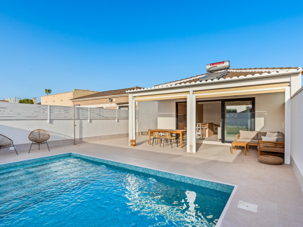 Villa Welcome to this beautifully renovated villa in El Chaparral neighborhood of Torrevieja. Offering a perfect mix of modern comfort, high-tech upgrades, and Mediterranean charm, this property is ideal for relaxed living on the Costa Blanca. The villa's layout has been thoughtfully designed for convenience and flow. The entrance opens into a hall, which connects to rooms on the right side and the dining area and an open-plan kitchen. This stylish kitchen is fully equipped and perfectly positioned next to a covered patio with ceiling fans, ideal for outdoor dining. The home boasts three spacious bedrooms and two sleek, modern bathrooms come with electric blinds for added convenience. The living room also features electric blinds, ensuring privacy at the touch of a button. Outdoors, a private pool sits at the heart of a low-maintenance garden, designed for enjoying the villa's sunny southwest orientation. A covered terrace provides a comfortable spot for lounging or entertaining, while additional patio spaces and a separate storage room enhance functionality. This villa is packed with modern amenities, including ducted air conditioning throughout, solar panels that power both electricity and hot water, and underfloor heating in the bathrooms. For peace of mind, the property is equipped with a security camera system. Fully furnished and move-in ready, this home offers built-in wardrobes and ceiling fans. Whether you're looking for a serene family retreat or a stylish holiday getaway, this property has it all. Located in a quiet yet accessible area, you'll enjoy easy access to everything Torrevieja and the Costa Blanca have to offer.Buy with confidence
