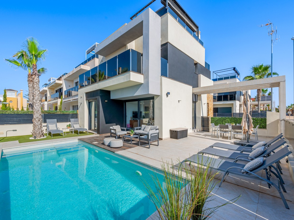 VillaExclusive 4-bedroom villa, ideally located in the highly sought-after area of Lomas de Cabo Roig - just moments from the beach, renowned golf courses, and a wide selection of local amenities.This stylish property boasts a sleek and spacious design, offering four generously proportioned bedrooms, each with its own en-suite bathroom and high ceilings.